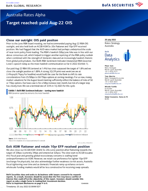 【BofA Securities】【20220720】BOFA-Australia Rates Alpha Target reached, paid Aug-22 OIS-6页