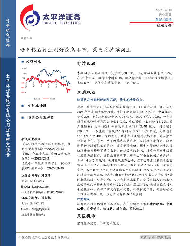 【太平洋证券】【20220410】20220410-太平洋-机械设备行业周报:培育钻石行业利好消息不断,景气度持续向上-15页