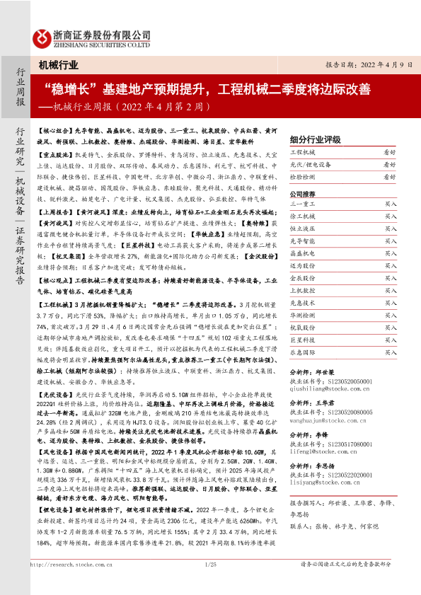 【浙商证券】【20220409】机械行业周报(2022年4月第2周):“稳增长”基建地产预期提升,工程机械二季度将边际改善-25页