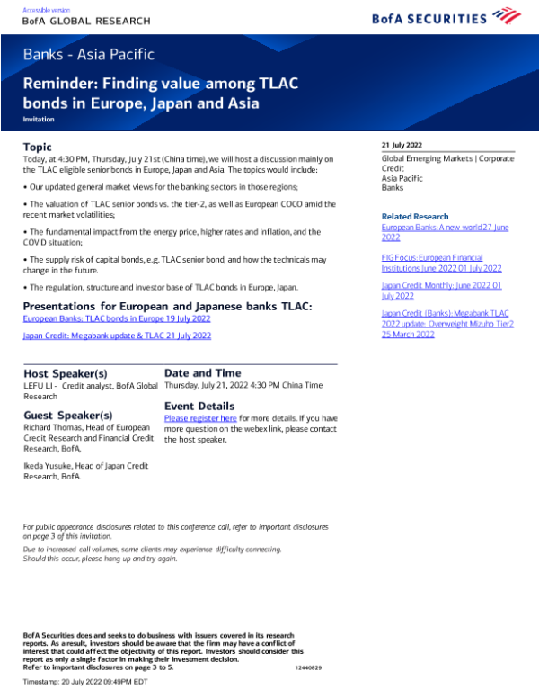 【BofA Securities】【20220721】Banks - Asia Pacific Reminder Finding value among TLAC bonds in Europe, Japan and Asia-5页