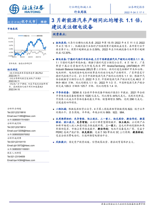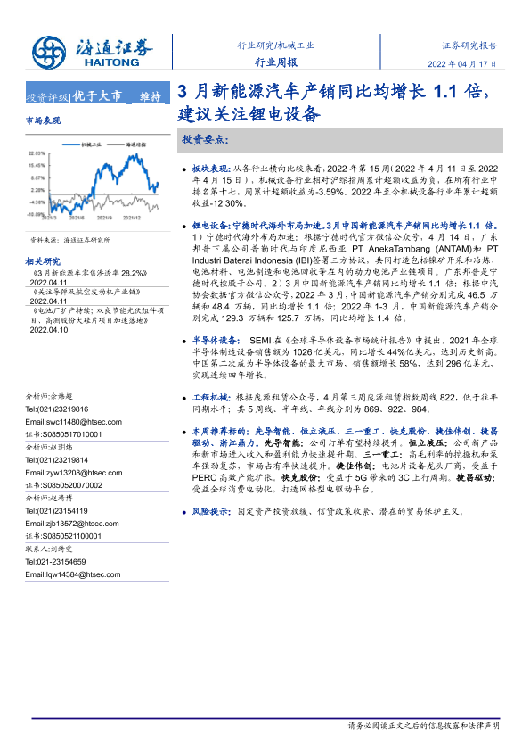 【海通证券】【20220417】20220417-海通证券-机械工业行业周报:3月新能源汽车产销同比均增长1.1倍,建议关注锂电设备-9页