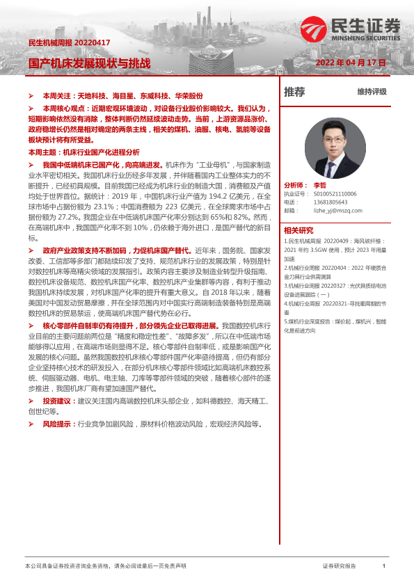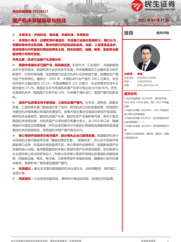 【民生证券】【20220417】20220417-民生证券-机械周报:国产机床发展现状与挑战-14页