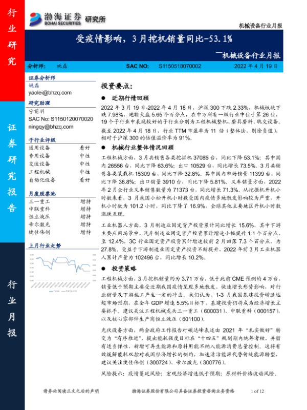 【渤海证券】【20220419】20220419-渤海证券-机械设备行业月报:受疫情影响,3月挖机销量同比-53.1%-12页