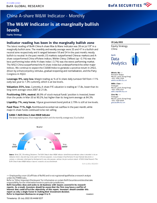 【BofA Securities】【20220720】BOFA-China Equity Strategy_A-share W&W Indicator - Monthly-9页