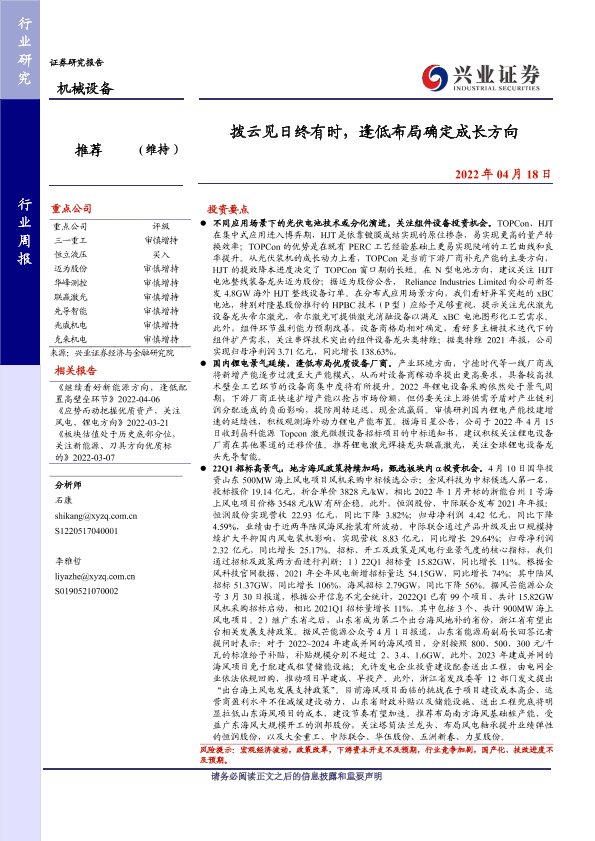 光伏电池技术 机械设备 行业周报 锂电设备 风电项目