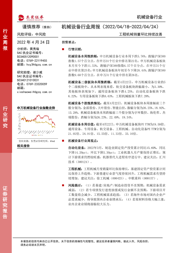 【东莞证券】【20220424】机械设备行业周报:工程机械销量环比持续改善-13页