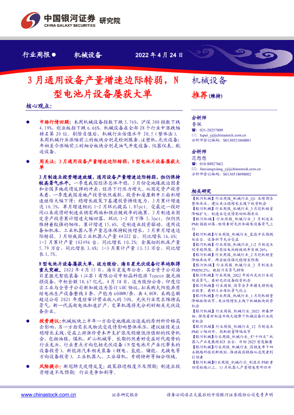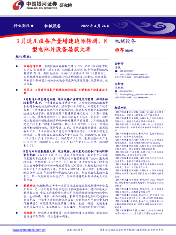 【银河证券】【20220424】中国银河-机械设备行业周报:3月通用设备产量增速边际转弱,N型电池片设备屡获大单-17页