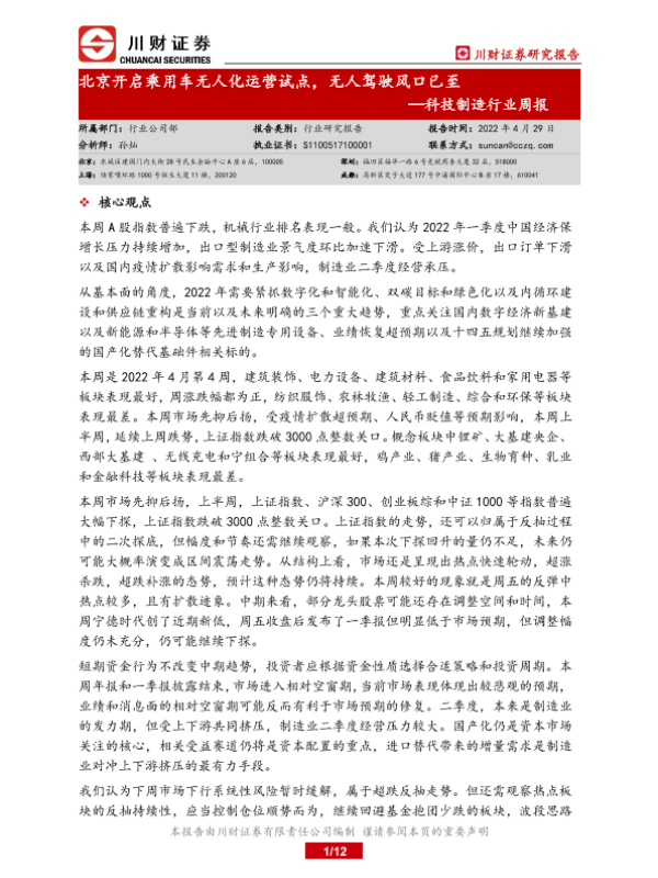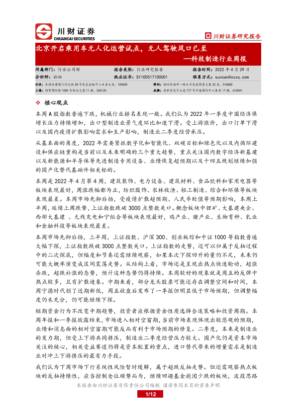 【川财证券】【20220429】科技制造行业周报:北京开启乘用车无人化运营试点,无人驾驶风口已至-12页