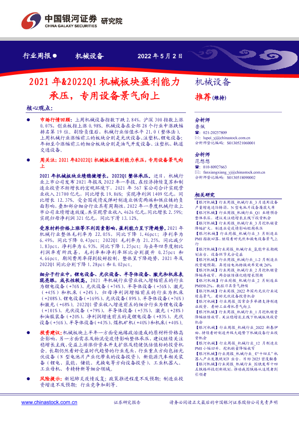 【银河证券】【20220502】2021年&2022Q1机械板块盈利能力承压,专用设备景气向上-18页