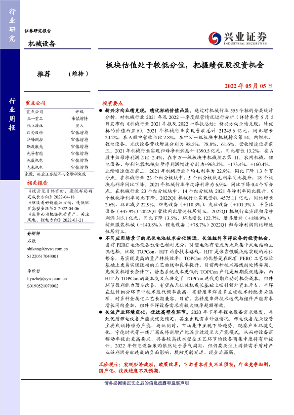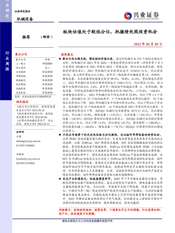 【兴业证券】【20220505】20220505-兴业证券-机械设备行业周报:板块估值处于较低分位,把握绩优股投资机会-34页