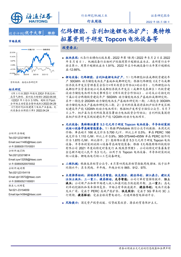 【海通证券】【20220508】20220508-海通证券-机械工业行业周报:亿纬锂能、吉利加速锂电池扩产;奥特维拟募资用于研发Topcon电池设备等-9页