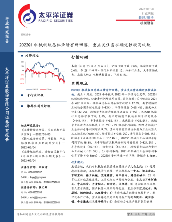 【太平洋证券】【20220508】20220508-太平洋-机械设备行业周报:2022Q1机械板块总体业绩有所回落,重点关注需求确定性较高板块-18页
