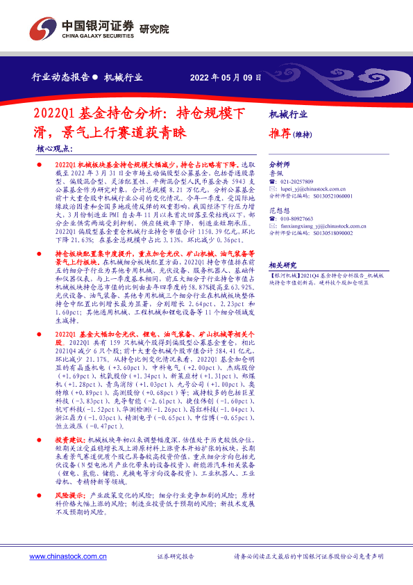【银河证券】【20220509】机械行业2022Q1基金持仓分析:持仓规模下滑,景气上行赛道获青睐-9页