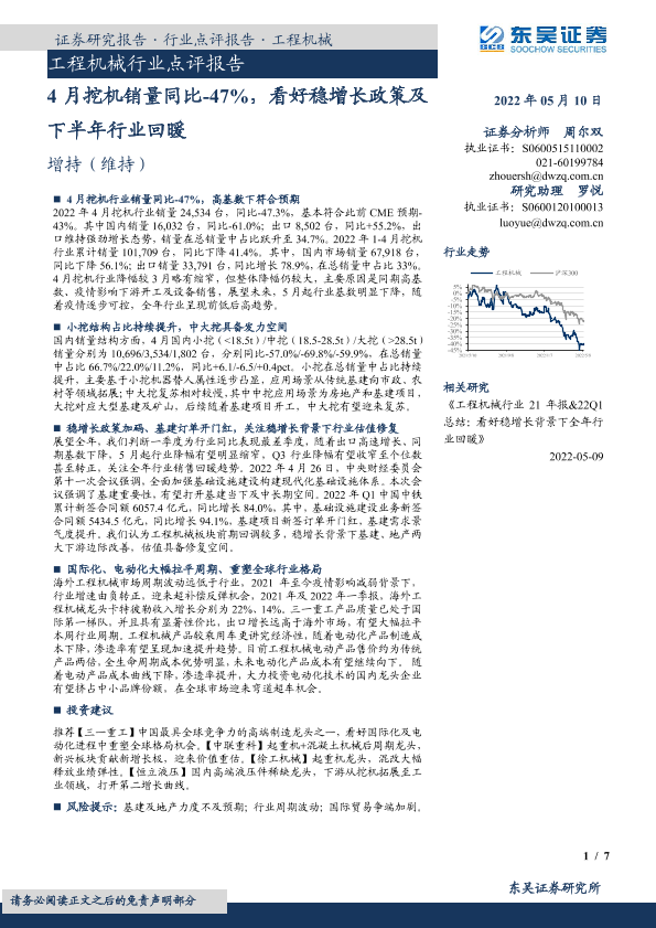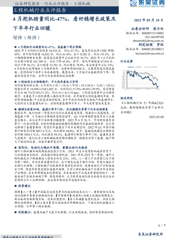 【东吴证券】【20220510】20220510-东吴证券-工程机械行业点评报告:4月挖机销量同比-47%,看好稳增长政策及下半年行业回暖-7页