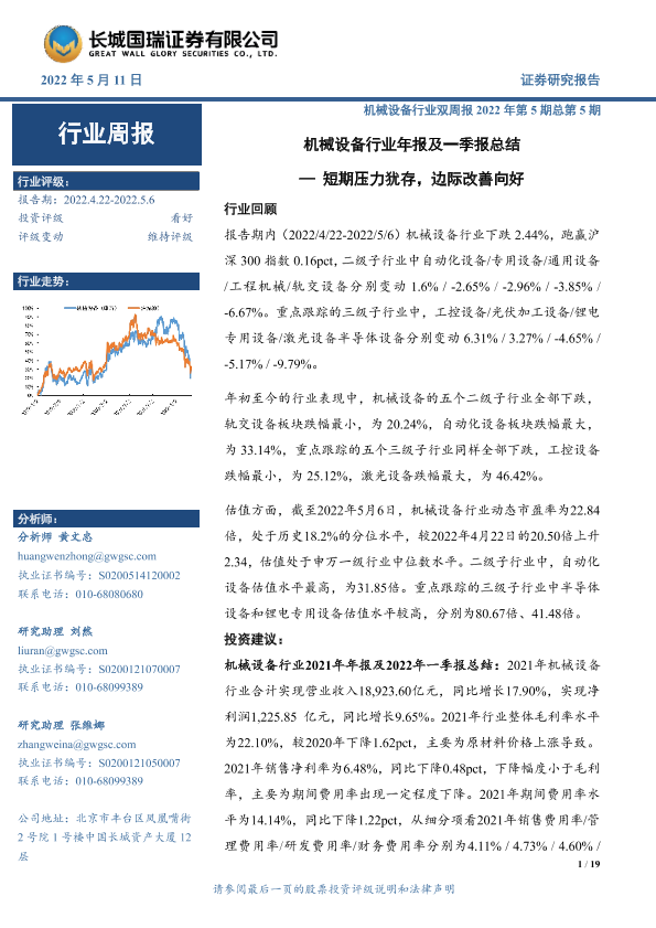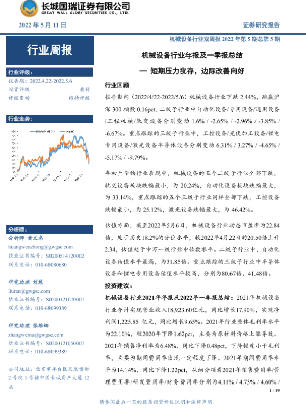 【长城国瑞证券】【20220511】机械设备行业双周报2022年第5期总第5期:机械设备行业年报及一季报总结-短期压力犹存,边际改善向好-19页