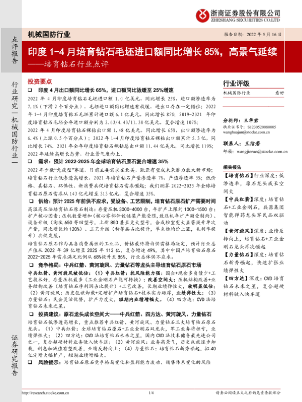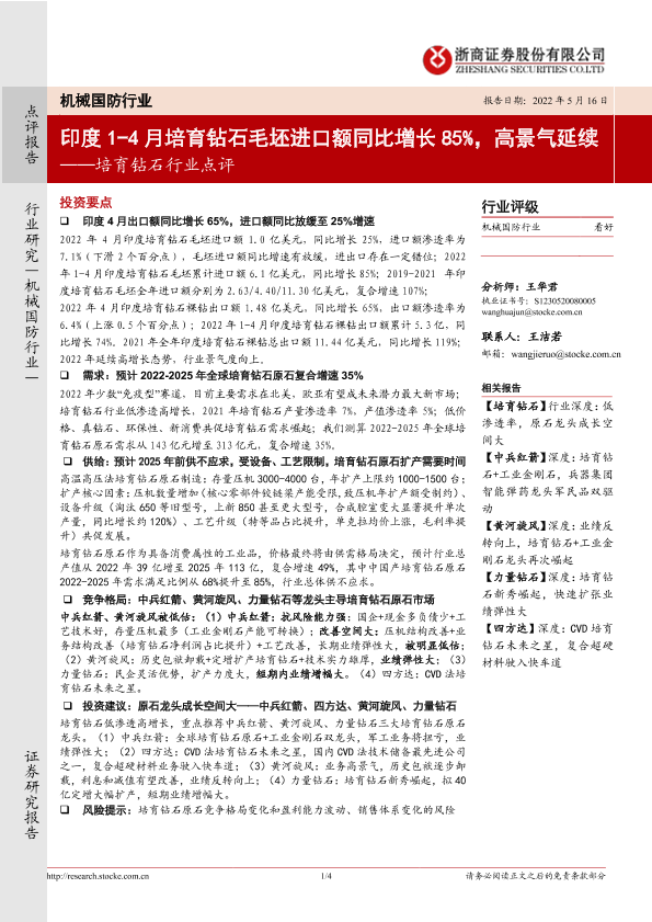 【浙商证券】【20220516】培育钻石行业点评:印度1-4月培育钻石毛坯进口额同比增长85%,高景气延续-4页