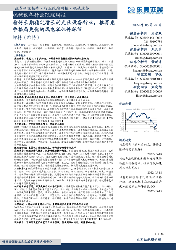 【东吴证券】【20220522】20220522-东吴证券-机械设备行业跟踪周报:看好长期稳定增长的光伏设备行业,推荐竞争格局更优的风电零部件环节-24页