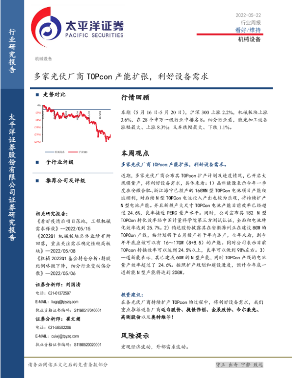【太平洋证券】【20220522】20220522-太平洋-机械设备行业周报:多家光伏厂商TOPcon产能扩张,利好设备需求-16页