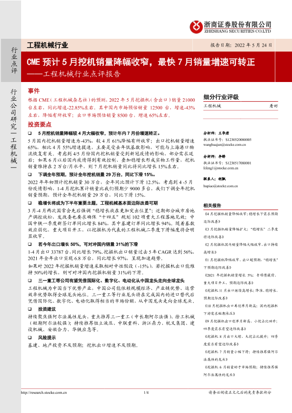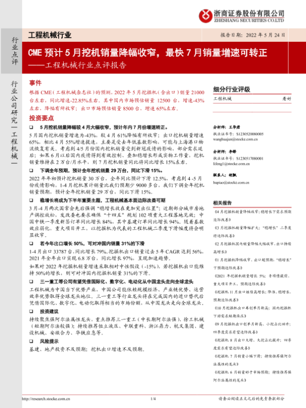 【浙商证券】【20220524】20220524-浙商证券-工程机械行业点评报告:CME预计5月挖机销量降幅收窄,最快7月销量增速可转正-4页
