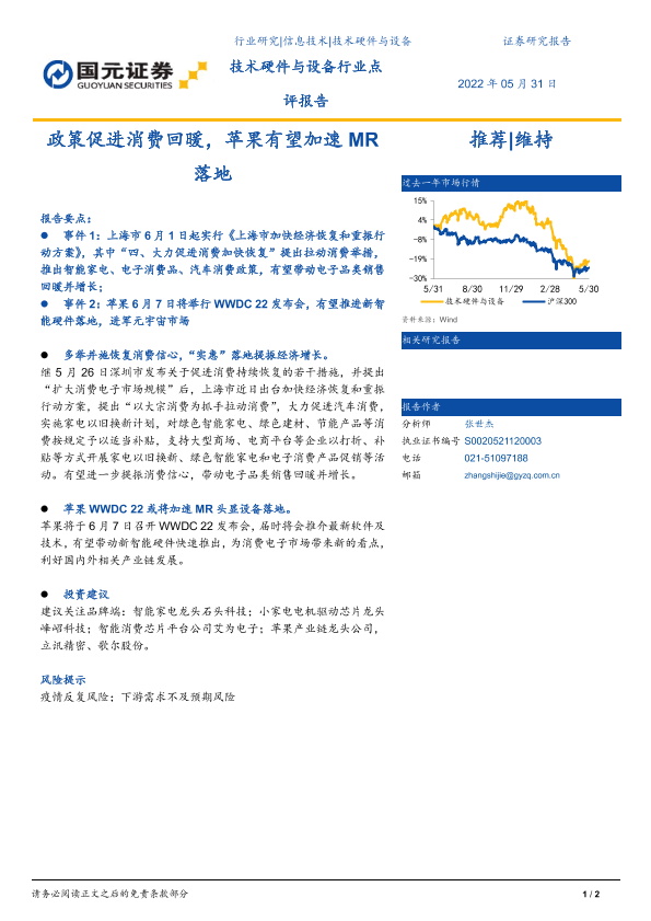 【国元证券】【20220531】技术硬件与设备行业点评报告:政策促进消费回暖,苹果有望加速MR落地-2页