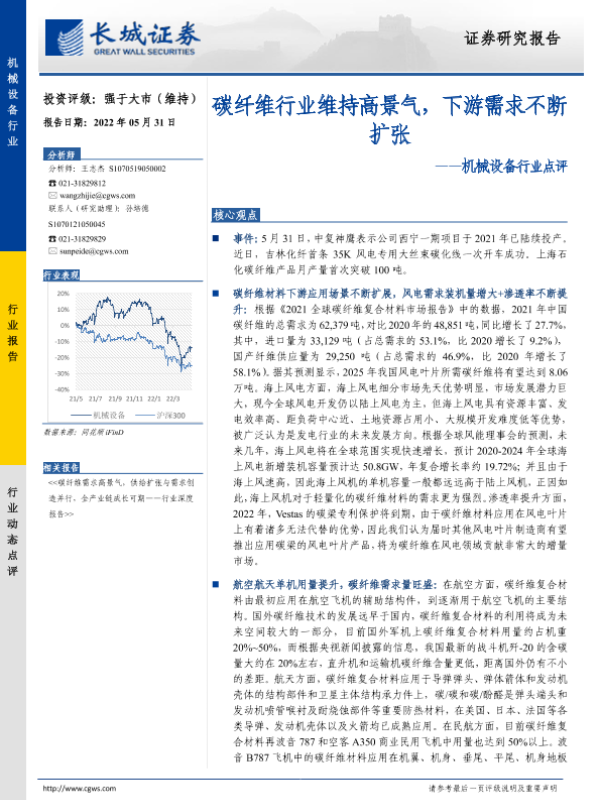 【长城证券】【20220531】20220531-长城证券-机械设备行业点评:碳纤维行业维持高景气,下游需求不断扩张-3页