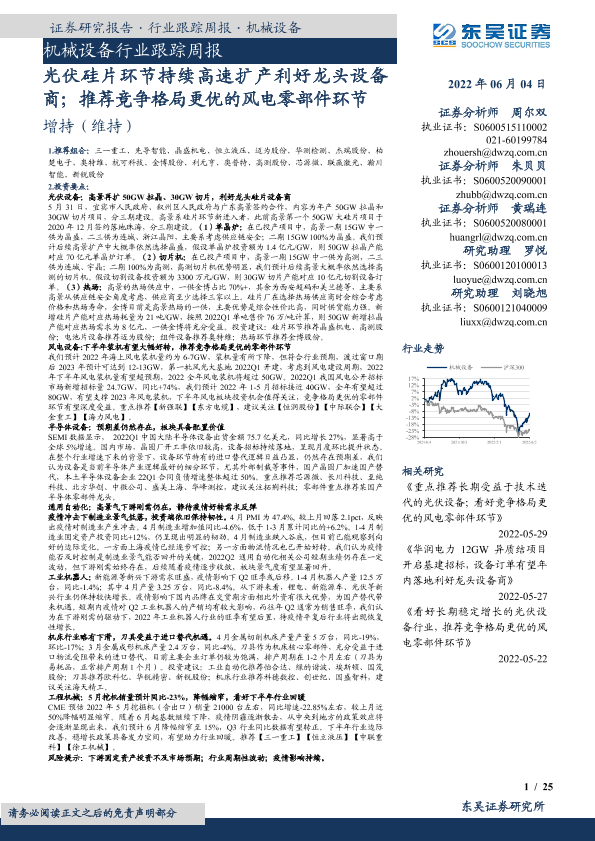 【东吴证券】【20220604】20220604-东吴证券-机械设备行业跟踪周报:光伏硅片环节持续高速扩产利好龙头设备商;推荐竞争格局更优的风电零部件环节-25页