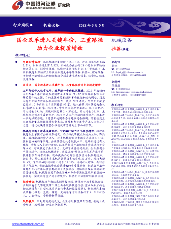 【银河证券】【20220605】20220605-中国银河-机械设备行业周报:国企改革进入关键年份,三重路径助力企业提质增效-19页