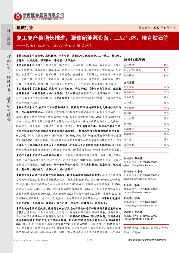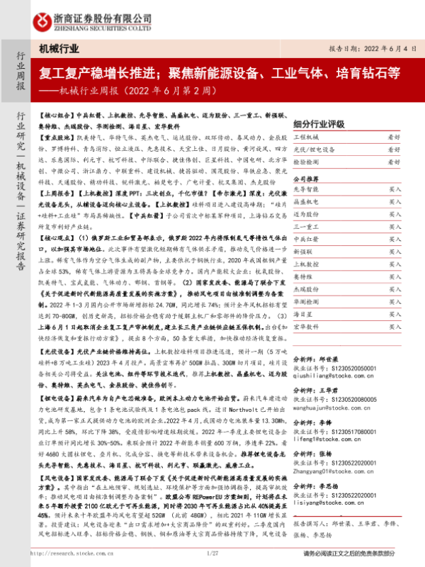 【浙商证券】【20220604】机械行业周报(2022年6月第2周):复工复产稳增长推进;聚焦新能源设备、工业气体、培育钻石等-27页
