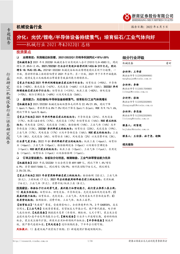 【浙商证券】【20220605】机械行业2021年&2022Q1总结:分化:光伏 锂电 半导体设备持续景气;培育钻石 工业气体向好-18页