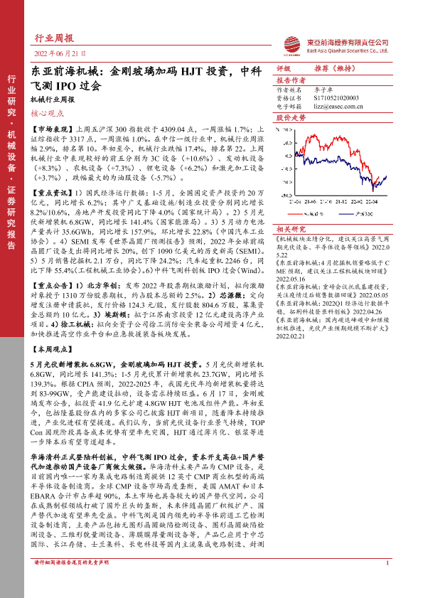 【东亚前海证券】【20220620】东亚前海机械:金刚玻璃加码HJT投资,中科飞测IPO过会-23页