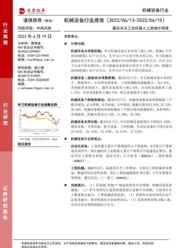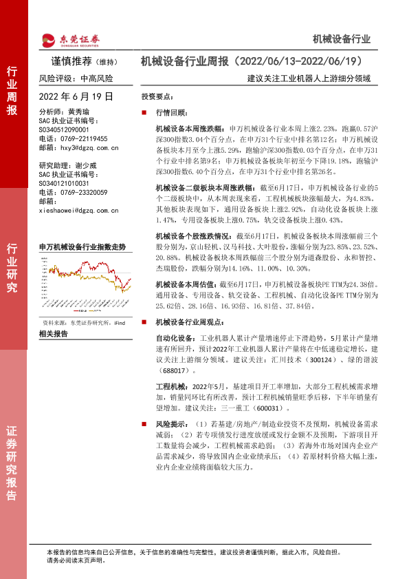 【东莞证券】【20220619】20220619-东莞证券-机械设备行业周报:建议关注工业机器人上游细分领域-15页