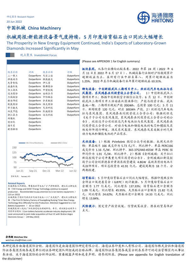【海通国际】【20220620】机械周报 新能源设备景气度持续,5月印度培育钻石出口同比大幅增长-15页