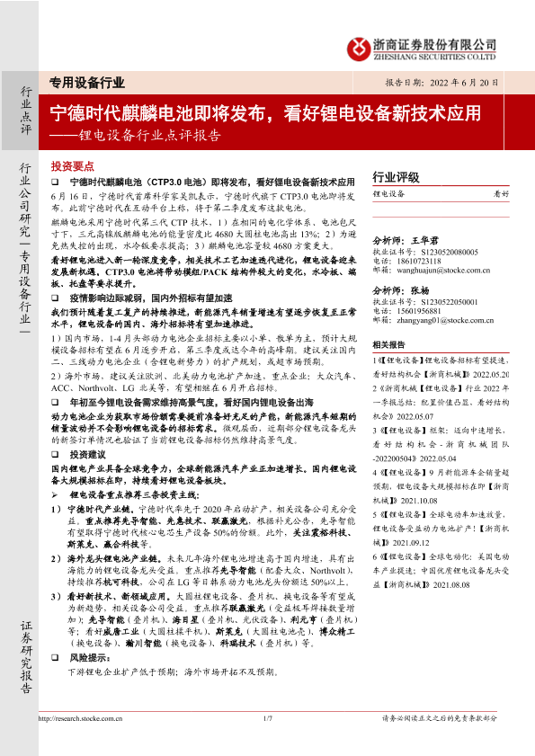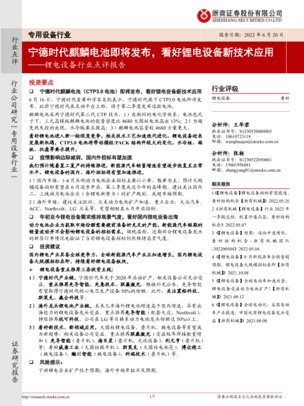 【浙商证券】【20220620】20220620-浙商证券-锂电设备行业点评报告:宁德时代麒麟电池即将发布,看好锂电设备新技术应用-7页