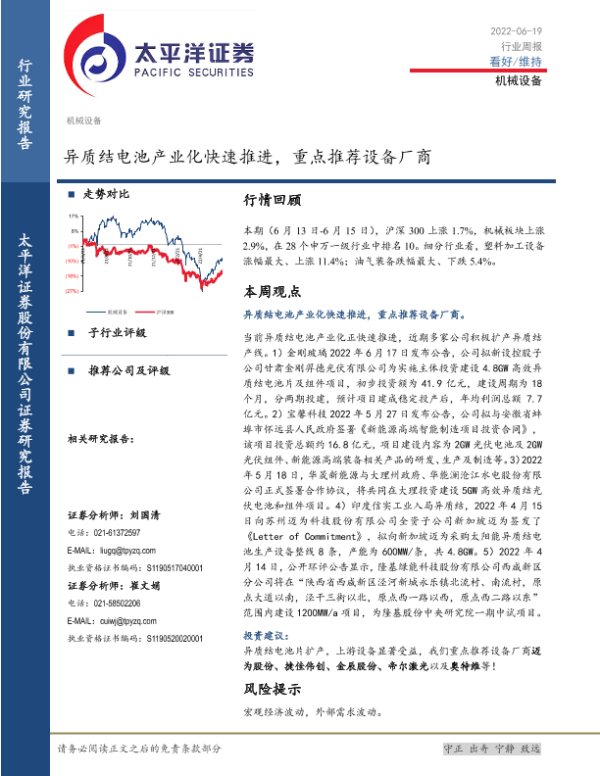 【太平洋证券】【20220619】20220619-太平洋-机械设备行业周报:异质结电池产业化快速推进,重点推荐设备厂商-18页