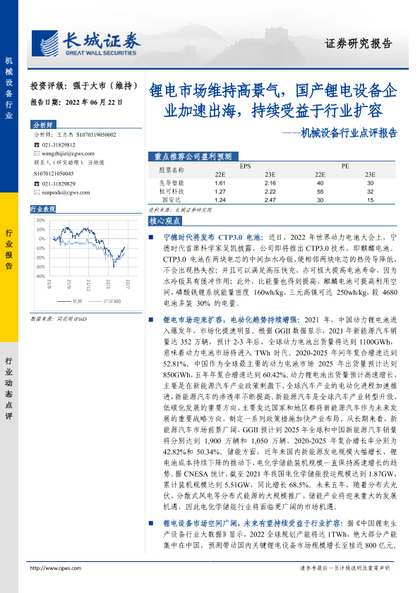 【长城证券】【20220622】20220622-长城证券-机械设备行业点评报告:锂电市场维持高景气,国产锂电设备企业加速出海,持续受益于行业扩容-3页