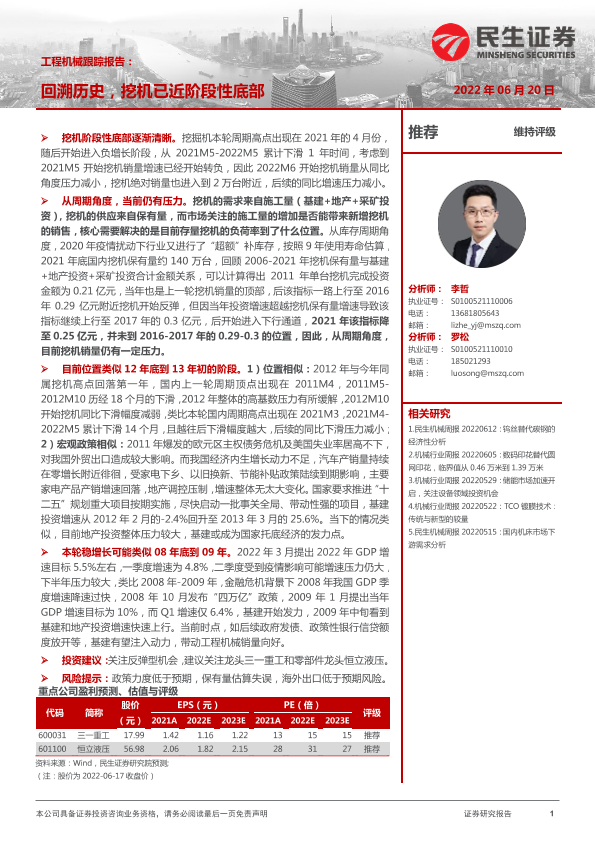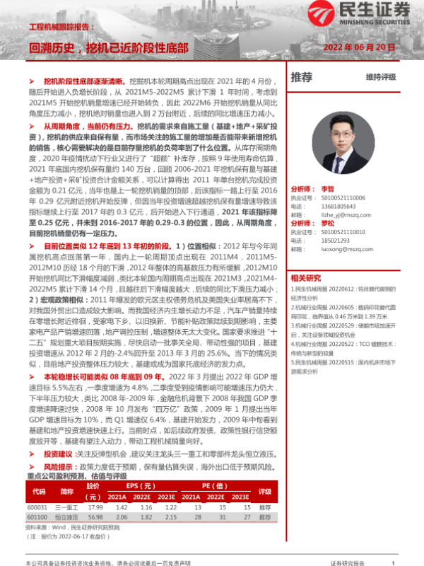 【民生证券】【20220620】工程机械跟踪报告:回溯历史,挖机已近阶段性底部-16页