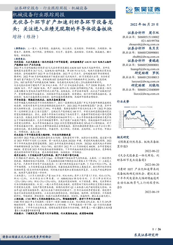 【东吴证券】【20220625】20220625-东吴证券-机械设备行业跟踪周报:光伏各个环节扩产加速利好各环节设备龙头;关注进入业绩兑现期的半导体设备板块-26页