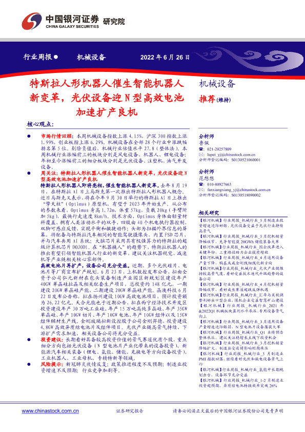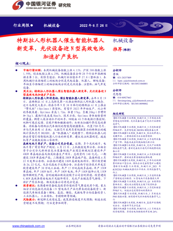 【银河证券】【20220626】20220626-中国银河-机械设备行业周报:特斯拉人形机器人催生智能机器人新变革,光伏设备迎N型高效电池加速扩产良机-16页