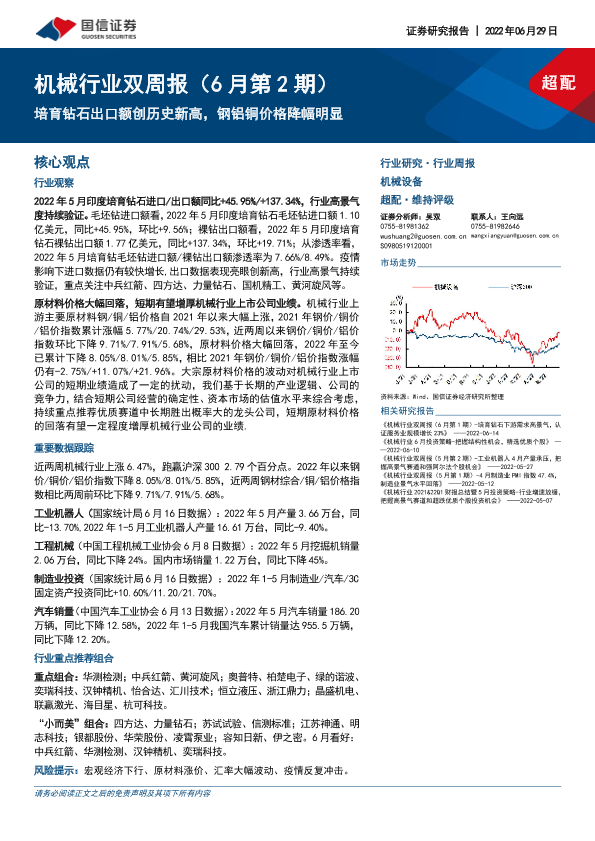 【国信证券】【20220629】机械行业双周报(6月第2期):培育钻石出口额创历史新高,钢铝铜价格降幅明显-25页