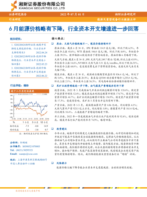 【湘财证券】【20220701】20220701-湘财证券-能源及重型设备行业数据点评:6月能源价格略有下降,行业资本开支增速进一步回落-6页