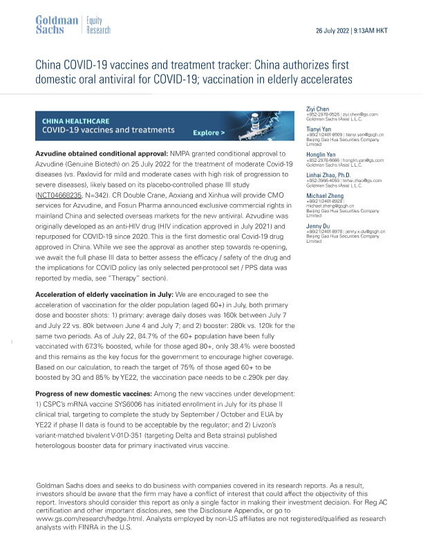 【Goldman Sachs】【20220726】中国授权首款国产口服抗病毒药物用于COVID-19;老年人接种加速-16页