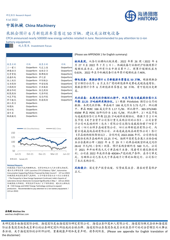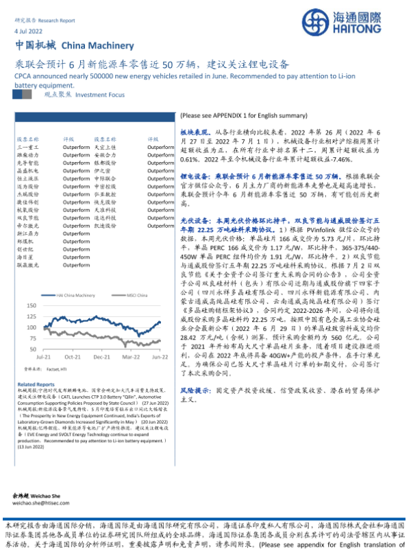 【海通国际】【20220704】中国机械:乘联会预计6月新能源车零售近50万辆,建议关注锂电设备-15页
