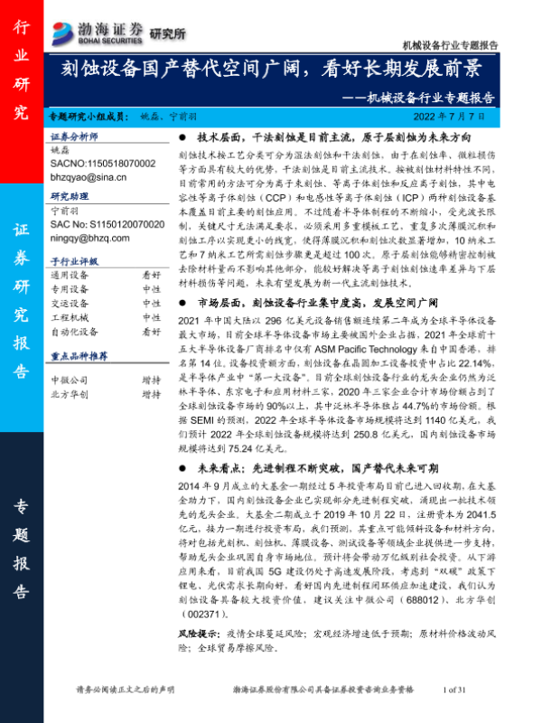 【渤海证券】【20220707】20220707-渤海证券-机械设备行业专题报告:刻蚀设备国产替代空间广阔,看好长期发展前景-31页
