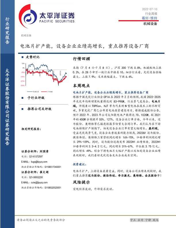 【太平洋证券】【20220710】20220710-太平洋-机械设备行业周报:电池片扩产能,设备企业业绩高增长,重点推荐设备厂商-13页