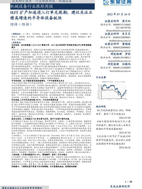 【东吴证券】【20220710】20220710-东吴证券-机械设备行业跟踪周报:HJT扩产加速进入订单兑现期;建议关注业绩高增速的半导体设备板块-28页