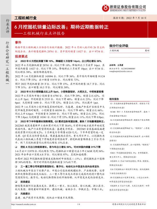 【浙商证券】【20220710】20220710-浙商证券-工程机械行业点评报告:6月挖掘机销量边际改善;期待近期数据转正-4页