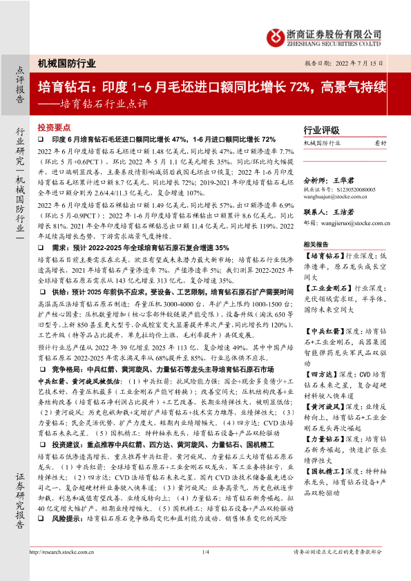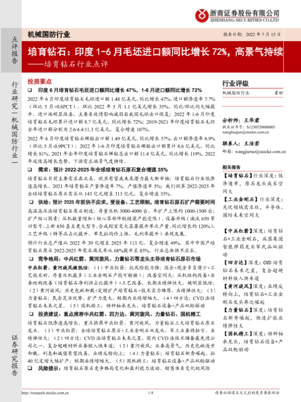 【浙商证券】【20220715】20220715-浙商证券-培育钻石行业点评:培育钻石:印度1-6月毛坯进口额同比增长72%,高景气持续-4页