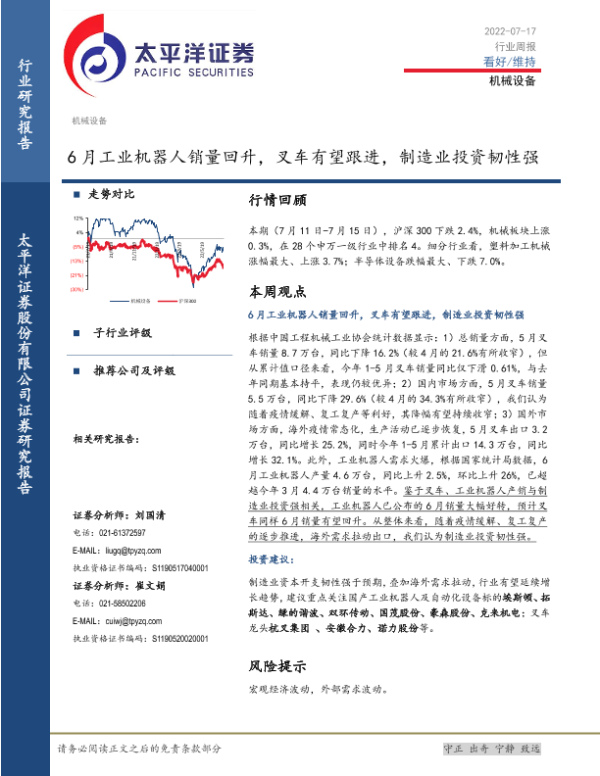 【太平洋证券】【20220717】20220717-太平洋-机械设备行业周报:6月工业机器人销量回升,叉车有望跟进,制造业投资韧性强-14页