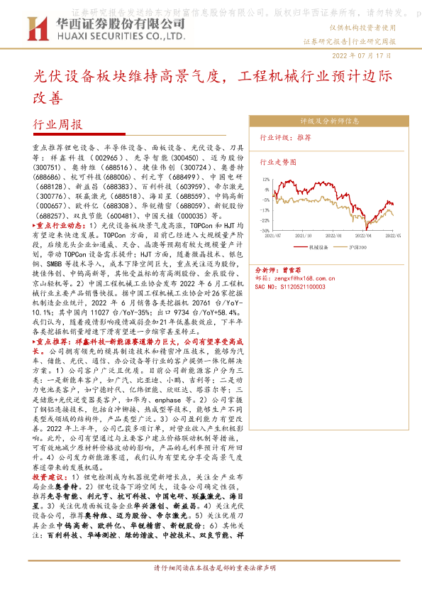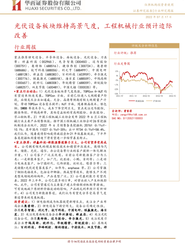 【华西证券】【20220717】20220717-华西证券-机械设备行业周报:光伏设备板块维持高景气度,工程机械行业预计边际改善-18页