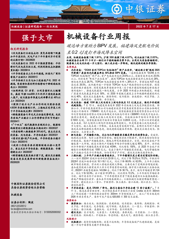 【中银证券】【20220717】20220717-中银证券-机械设备行业周报:碳达峰方案助力BIPV发展,福建海风竞配电价低至0.2元 度打开海风降本空间-16页